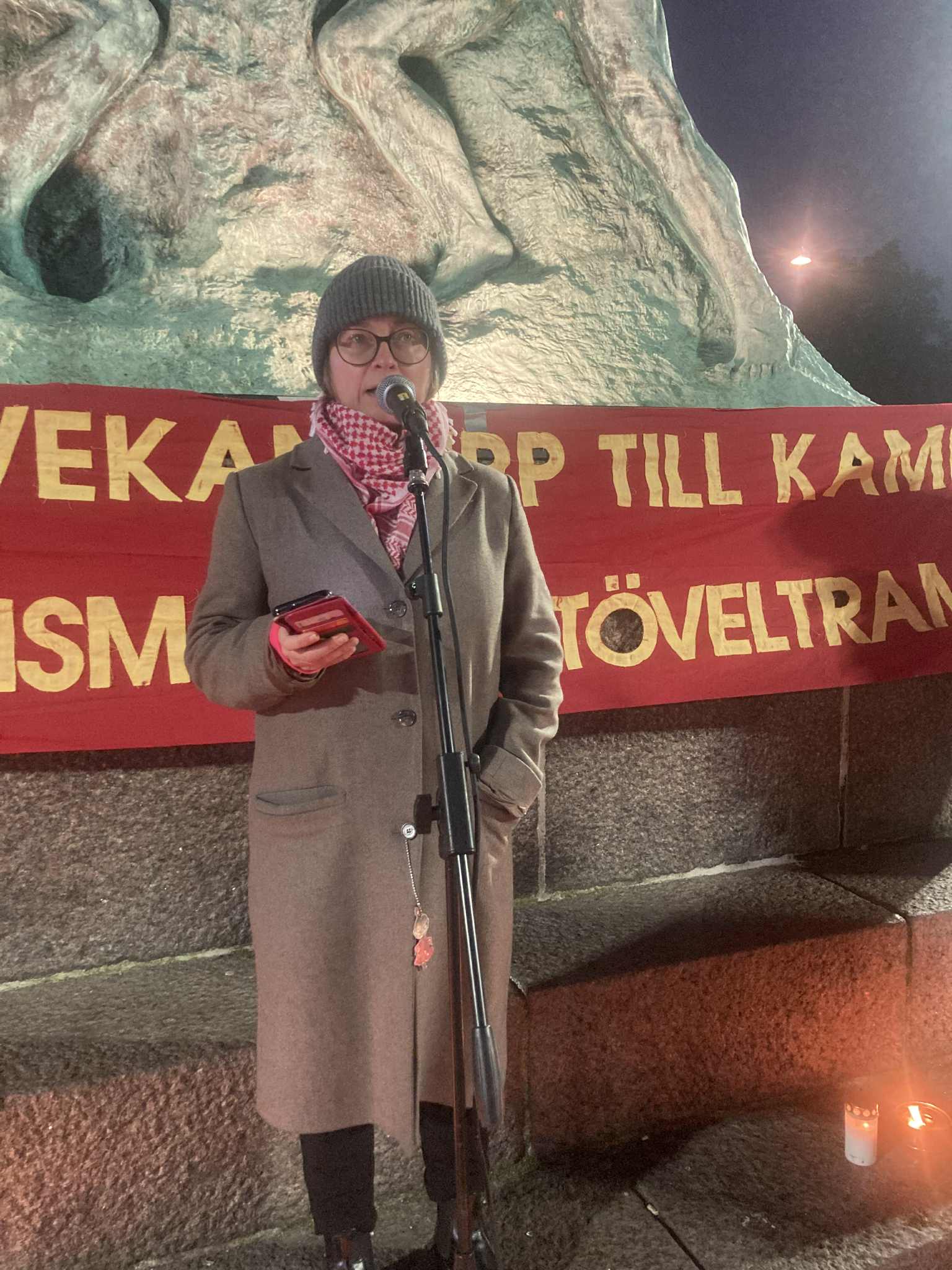 ”Ofta är vi det enda partiet som driver fackens och civilsamhällets krav”, säger Nina Jakku i intervjun. Här håller Jakku tal på Minnesdag för Novemberpogromen 2025.