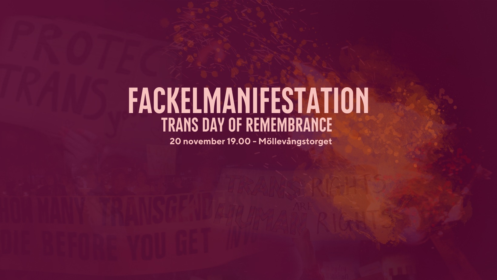 RFSU Malmö och Transammans Syd, tillsammans med Trans och Tjejtjouren i Malmö, Malmö Pride, RFSL Rådgivningen Skåne och RFSL Ungdom Malmö bjuder därför in till att samlas för att uppmärksamma dagen tillsammans i en fackelmanifestation där vi läser upp namnen på de som blivit dödade..