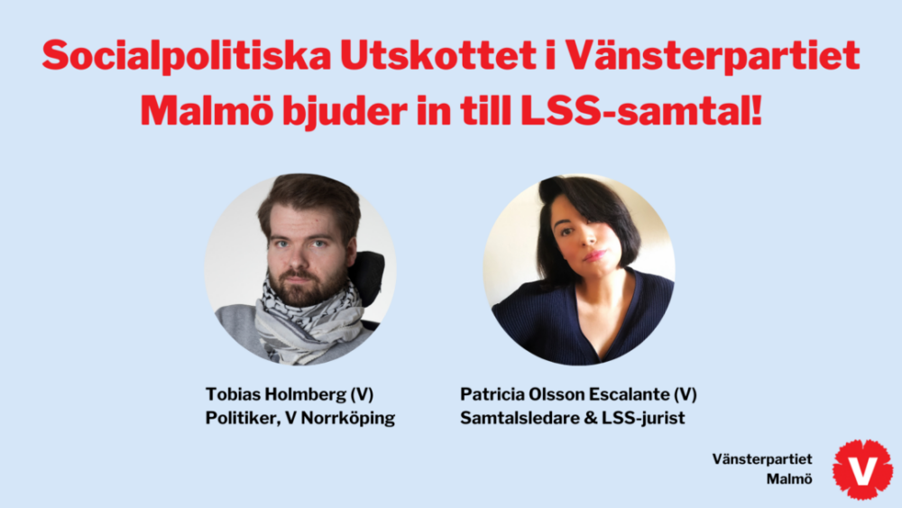 Vi välkomnar superaktivisten, ledamot i kommunfullmäktige Norrköping tillika ordförande i Vänsterpartiet Östergötland Tobias Holmberg till Malmö! Vad är LSS? Vad innebär personlig assistans? Vad betyder reformen? Hur ser det politiska läget ut? Vi pratar om LSS ur ett brett perspektiv. Samtalsledare: Patricia Escalante, LSS-jurist, V Malmö. Samtalet hålls i ABF: s lokal på Spånehusvägen 47, […] |