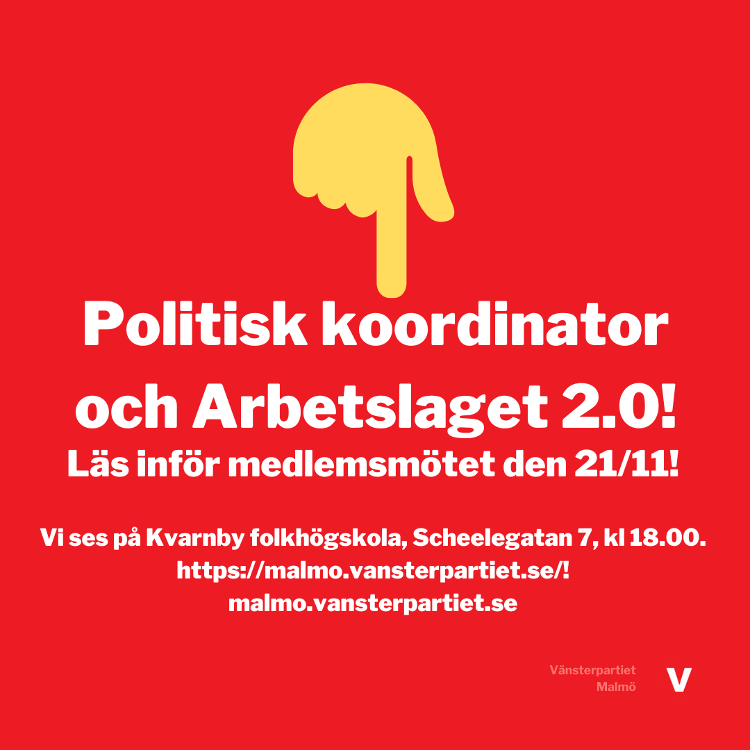 Till medlemsmötet 21/11: Politisk koordinator och Arbetslaget 2.0